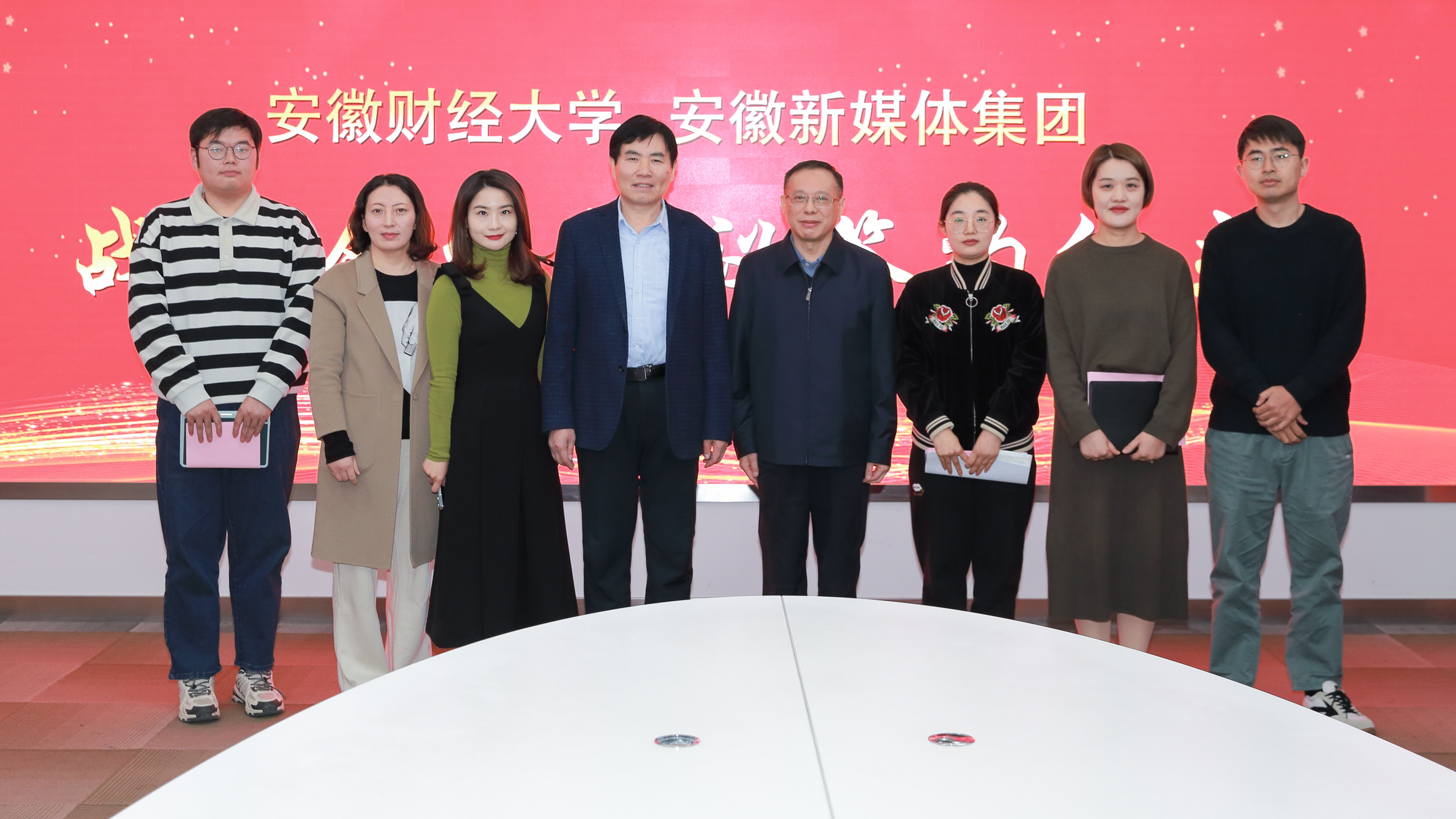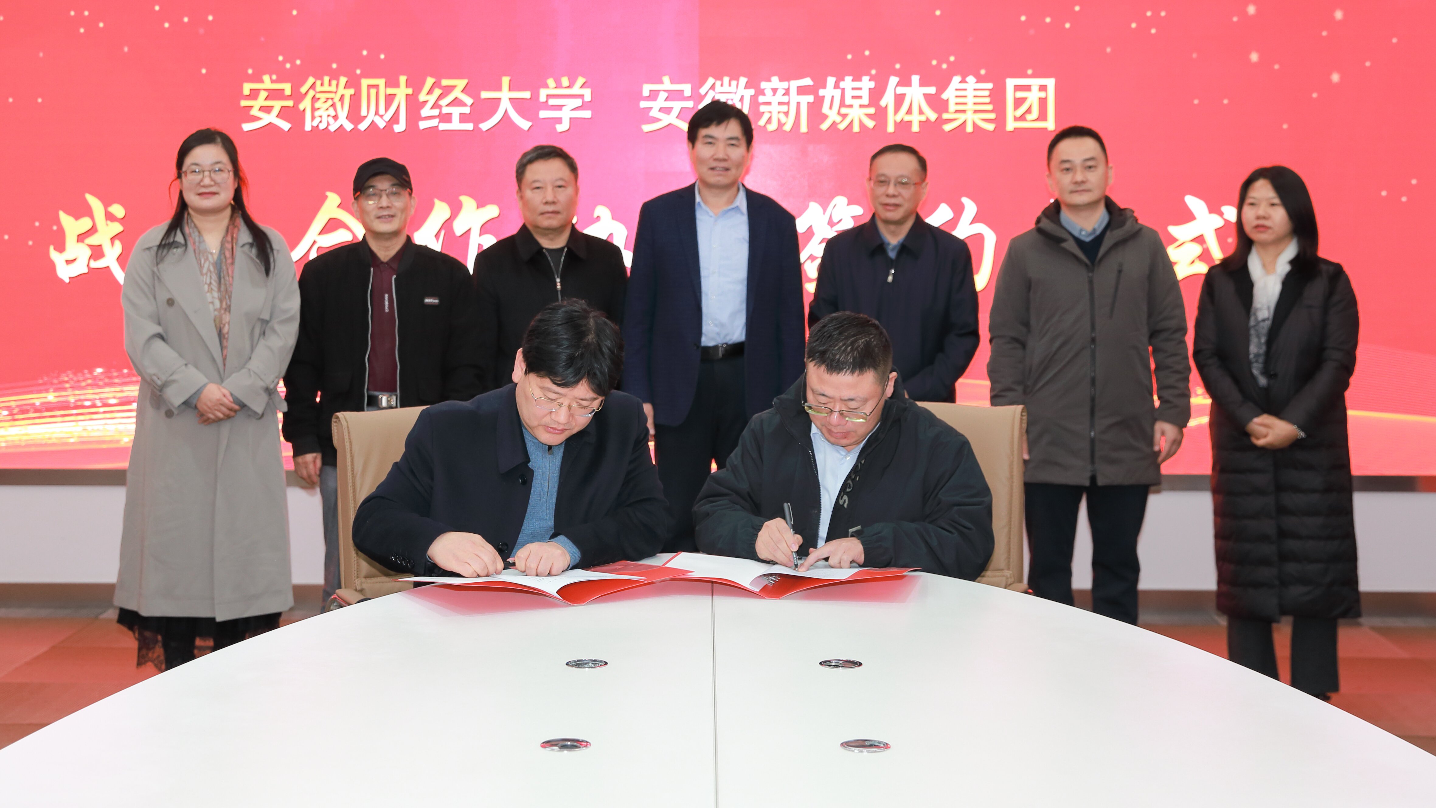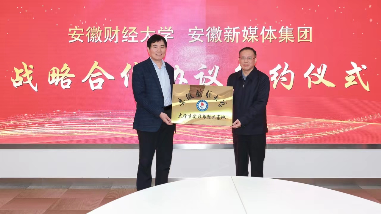 11月24日下午,安徽新媒體集團與安徽財經大學簽訂戰略合作協議。安徽財經大學黨委書記虞寶桃,安徽新媒體集團黨委書記、董事長、總經理章理中共同為安徽新媒體集團“安徽財經大學大學生實習與就業基地”揭牌,集團黨委委員、副總編輯陳偉出席簽約儀式。